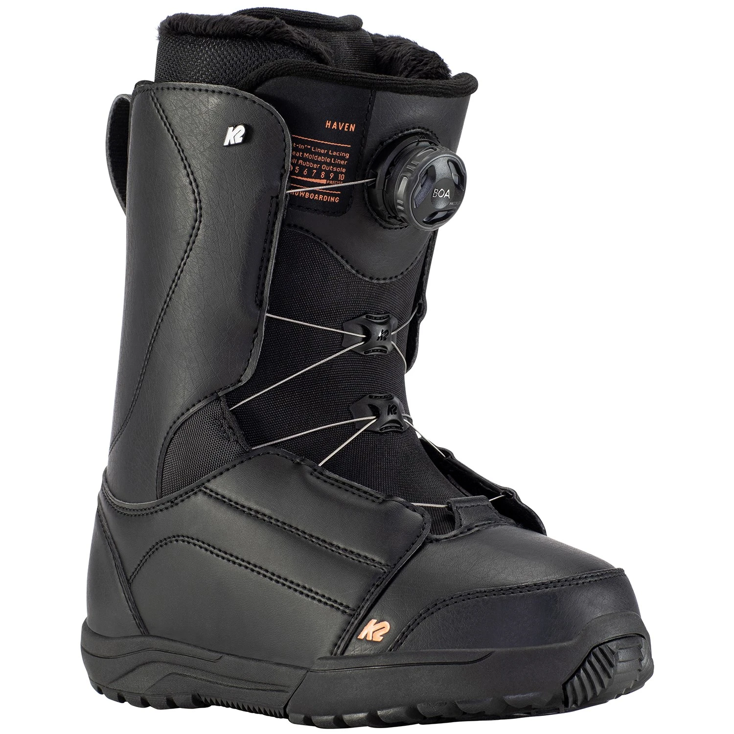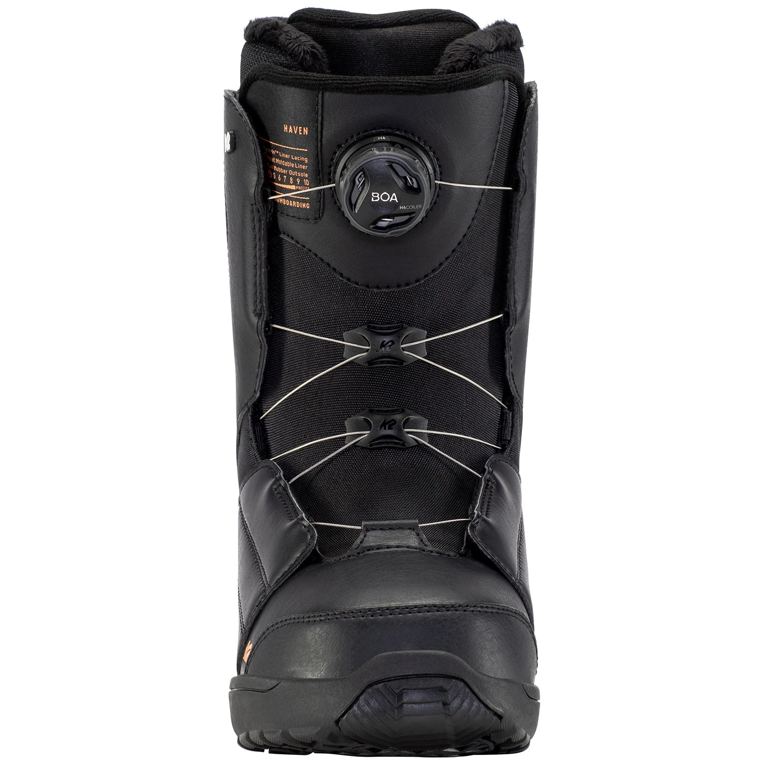 A cable and reel based lacing system that creates even tension and easy lacing operation. This system features low friction guides for even tightening. Boa® works to automatically retract lace slack so your boots stay nice and neat.